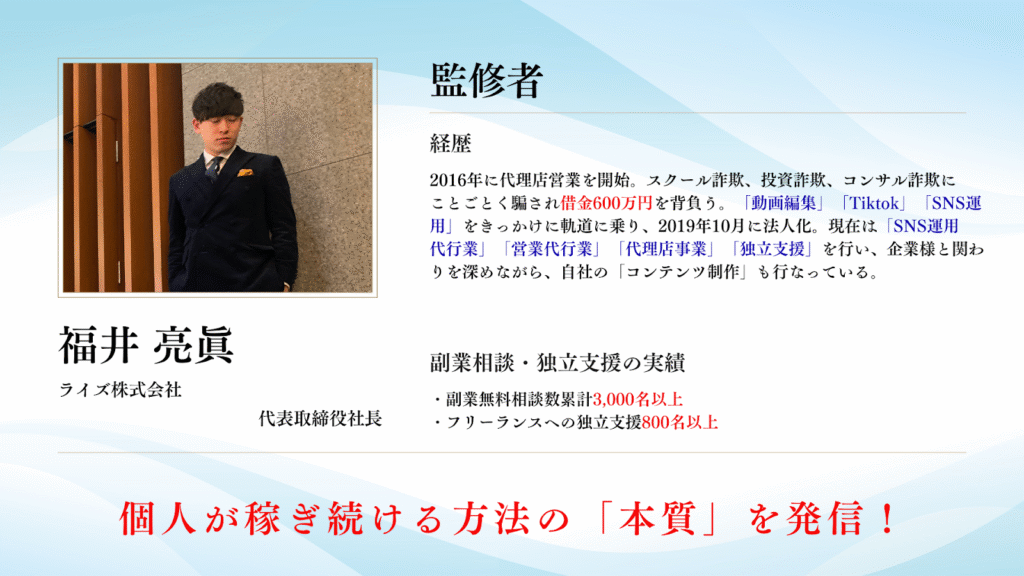 福井亮眞が監修するライズ株式会社のクリエイター育成プロジェクトでも、詐欺まがいの納品や著作権違反を避ける指導を徹底しています。信用を守り、副業としての信頼性を高めるためにも、著作権と商用利用の理解は必須です。